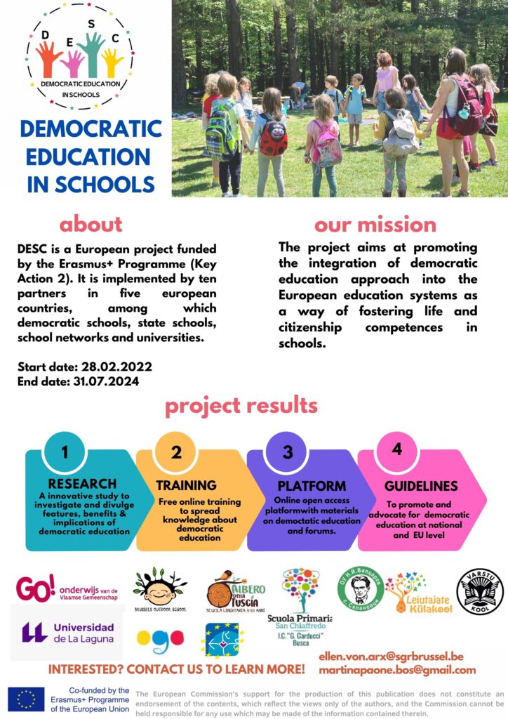 Albero Della Tuscia partecipa al progetto DESC, un progetto del programma “Erasmus +”, che ha l’ambizione di portare l’approccio dell’educazione democratica nelle scuole pubbliche europee. Il progetto durerà tre anni e vedrà la partecipazione di 10 partner in 5 Paesi diversi, tra cui scuole democratiche, scuole statali e università.