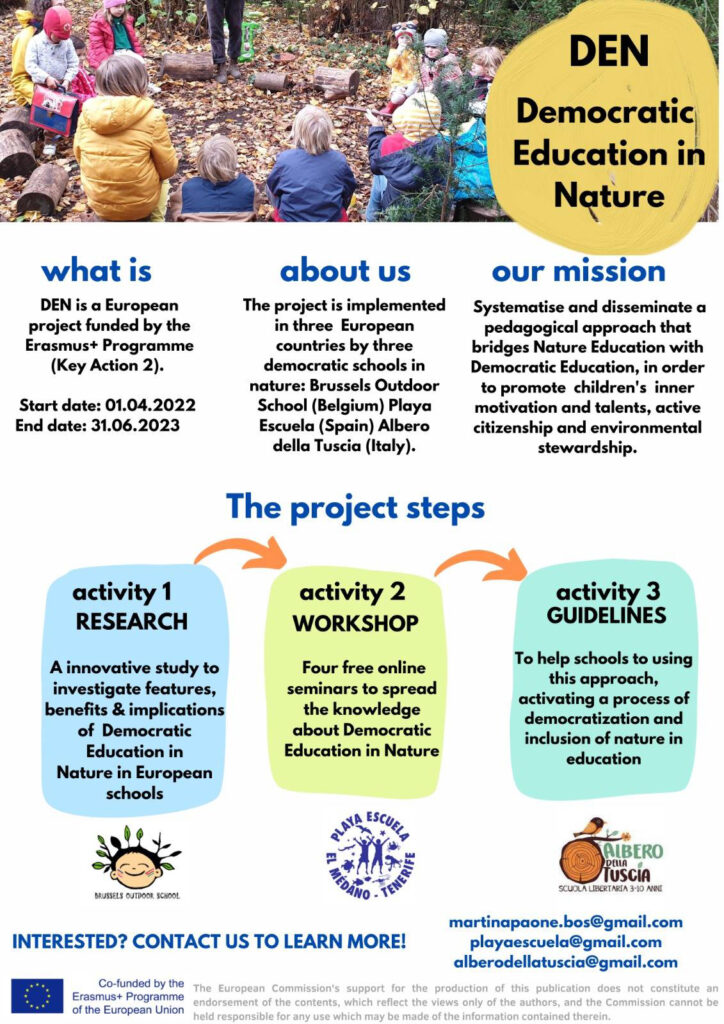 Albero Della Tuscia partecipa al progetto DEN, che ha l’ambizione di sistematizzare e diffondere un nuovo approccio in via di sviluppo che unisce la Pedagogia della Natura all’Educazione Democratica (Educazione Democratica nella Natura). Avendo un’esperienza pluriennale in questo campo, la nostra scuola e Playa Escuela promuoveranno una ricerca su questo approccio pedagogico e la sua applicazione in Europa, una serie di workshop per lo scambio di competenze e la formazione del personale scolastico, e linee guida per le nuove scuole per mettere in pratica l’educazione democratica nella natura.